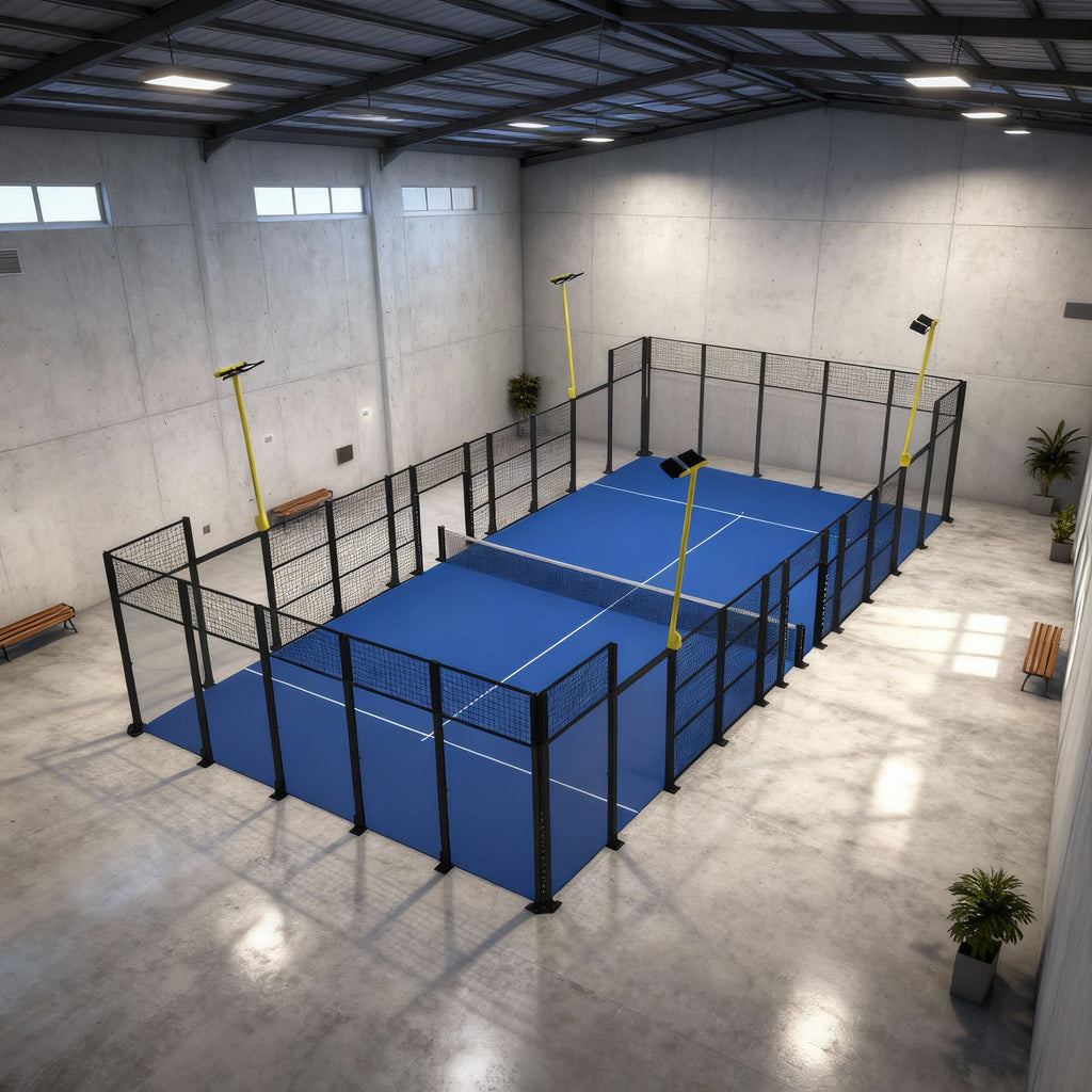 De Deluxe Indoor padelbaan is een duurzame en stijlvolle keuze voor sportcentra en hallen die willen investeren in kwaliteit. Deze professionele indoor padelbaan combineert een sterke staalconstructie met een hoogwaardige afwerking, waardoor hij perfect geschikt is voor intensief gebruik en een consistente speelervaring.